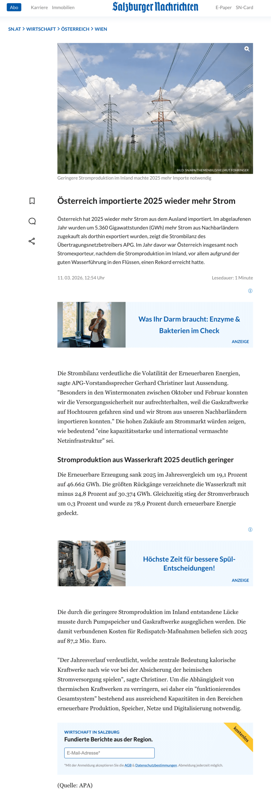 11. März 2026: SN.at: Österreich importierte 2025 wieder mehr Strom -> PNG